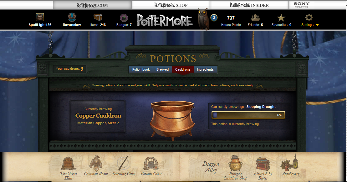 You can now click on the "Potion Book" tab and start to brew another Sleeping Draught. Once you get into the hang of things, you should be able to brew a new potion about every hour.
