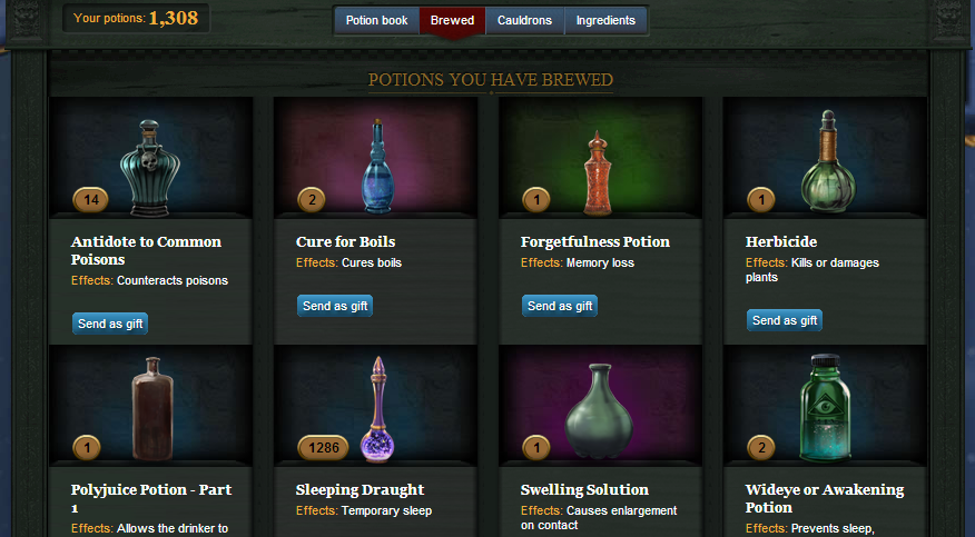 Pottermore allows members to send gifts to their friends. These gifts are limited to items that can be earned in the game. Once you send a gift to a friend, you can return to the story line and obtain the item again. This allows members to help one another. For example, if someone is very good at brewing potions, others can send that person potion ingredients, which allows members to work together.